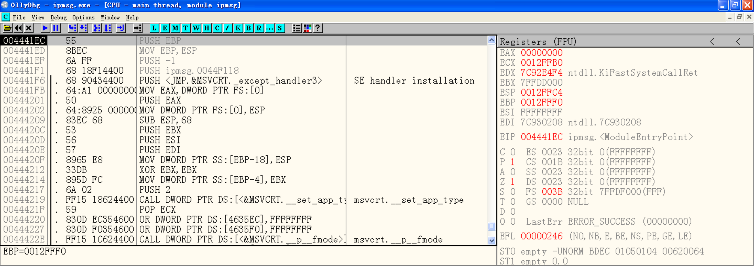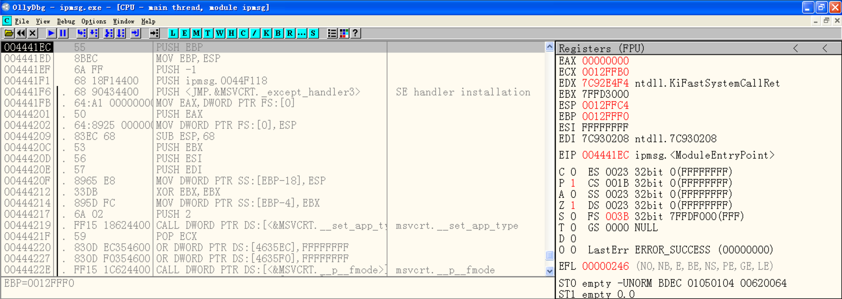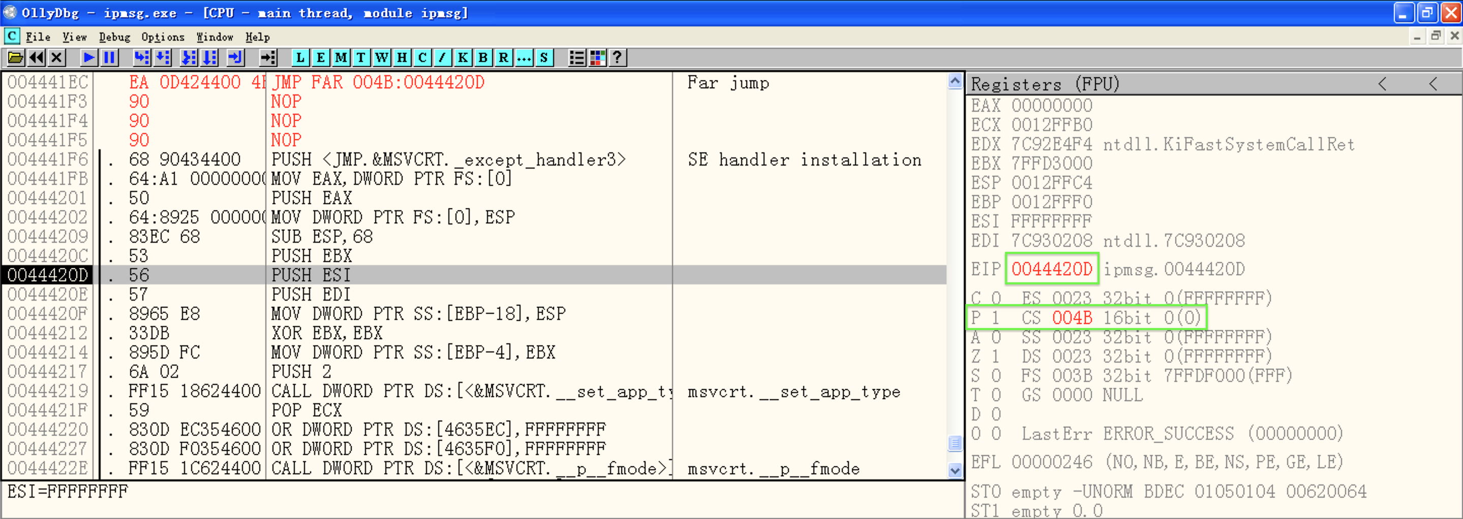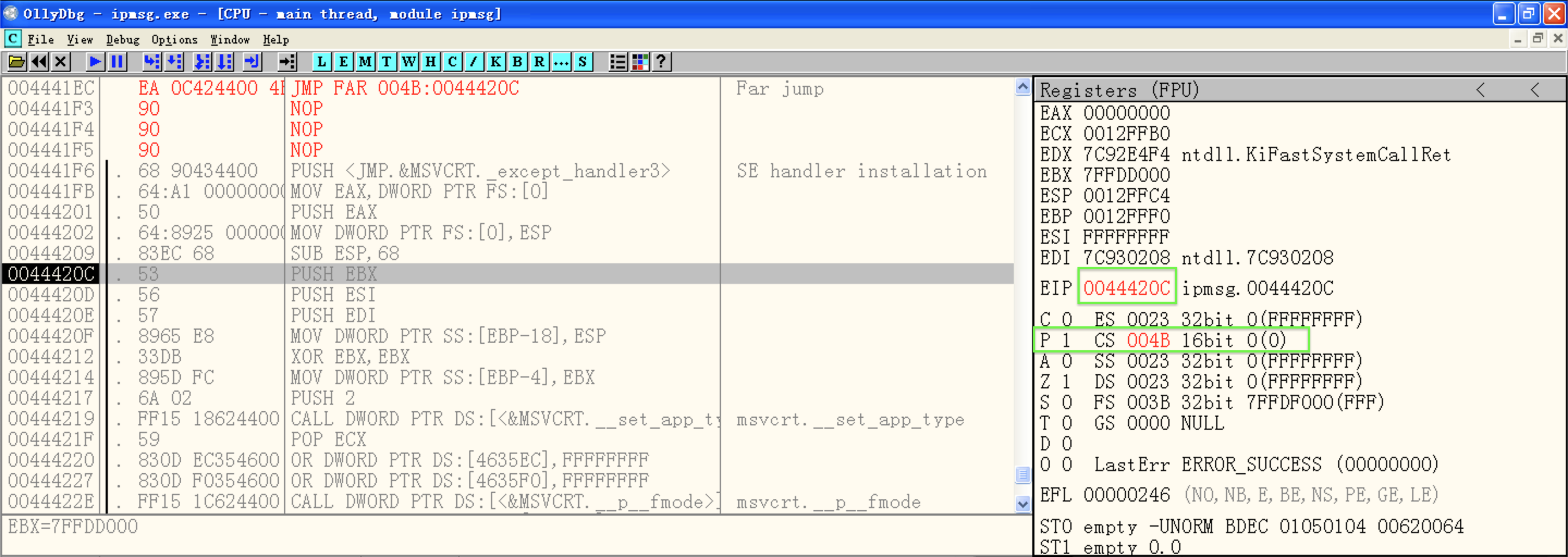 打开OD观察此时的CS=0x1B、EIP=0x00441EC如下图
