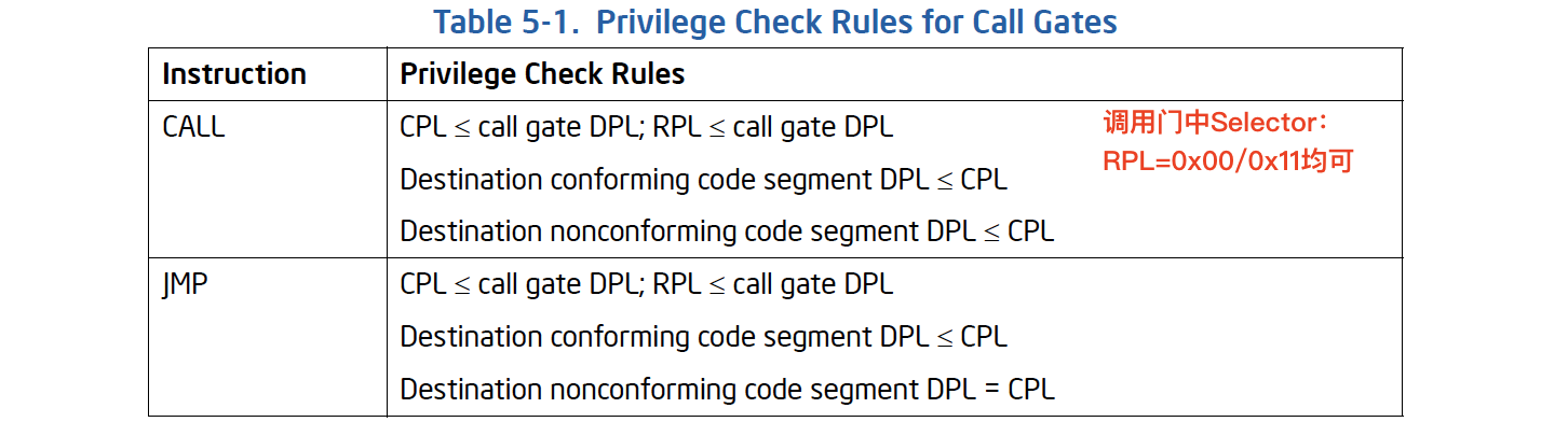 注意:直接对代码段进行JMP 或者 CALL的操作,无论目标是一致代码段还是非一致代码段,CPL都不会发生改变.如果要提升CPL的权限,只能通过调用门。